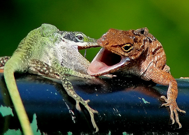 In the past few decades, the green lizards common in Florida and nearby islands, Anolis carolnensis, have faced intense competition from a new rival, an invasive species of brown lizards, Anolis sagrei, from Cuba. The invasive species threatens the Florida green anoles, not by attacking them, but by competing with them for the same food in the same habitat.