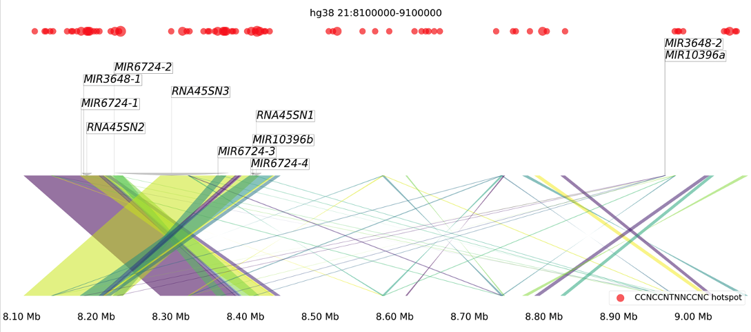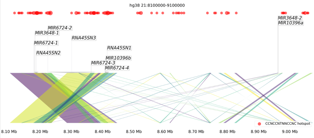 As we zoomed in closer, we noticed two things: a) the entire short arm of human chromosome #21 is kind of just a mess, and b) a 1.2 million base-pair region has undergone extensive genomic rearrangements not observed in the other apes. As we continued our analysis, we noticed that this region of the chromosome is home to 8 different microRNA genes, grouped into three families, and that none of these genes are found in the other apes (although there are similar DNA sequences).