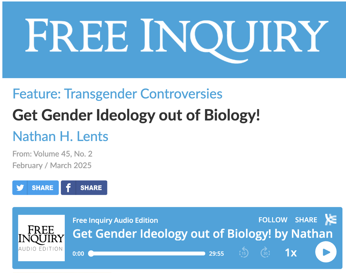 In honor of pride month, I am reprinting below an article I published earlier this year in a special section of Free Inquiry magazine all to do with “transgender matters.” Because it included perspectives from across the spectrum, pun intended, there is much that I disagree with, passionately in some cases. But I do give credit to editor-in-chief Ron Lindsay for soliciting a wide variety of articles, and specifically giving space for me to present my comprehensive perspective of the emerging new science of sex and gender.