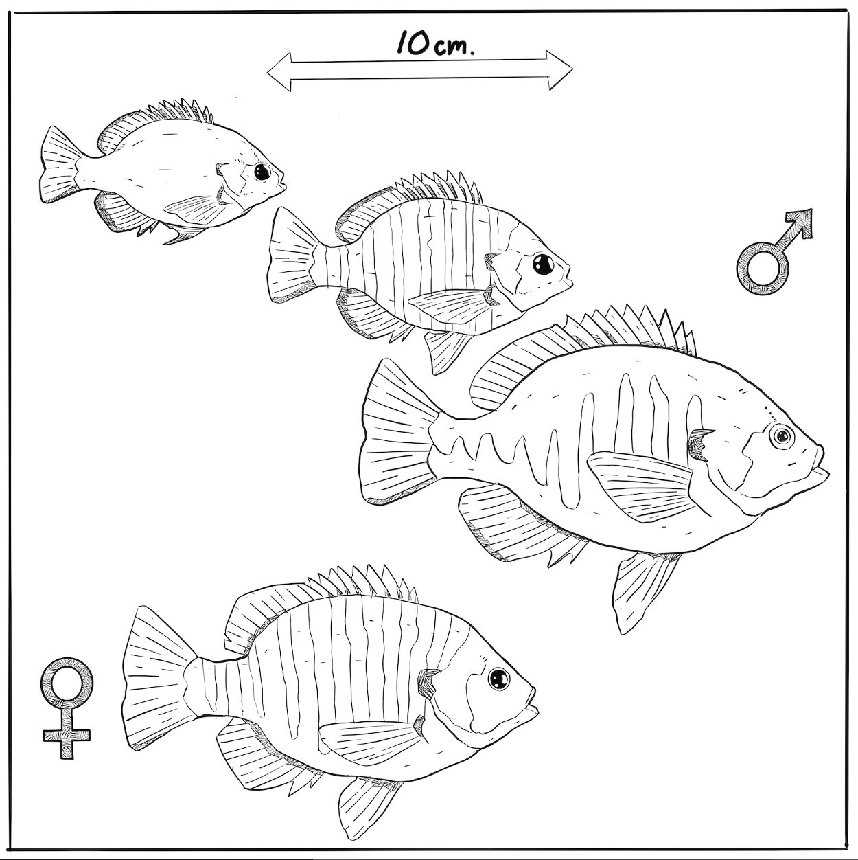 Another 15 percent of males are medium sized and often called “cooperators” because, rather than wooing females on their own, they attempt to partner with large males and work together to entice a female to lay eggs in their jointly guarded nest. In fact, large males and cooperator males have their own distinct mode of courtship that they use prior to agreeing to the partnership. And studies have shown that, all else being equal, females prefer large males that have an attached cooperator over those that don’t, presumably because the two males are better than one at guarding a nest. (Female sunfish quickly depart after depositing eggs, leaving males to guard them until they hatch.)